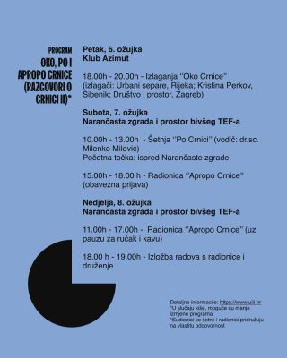 “Oko, po i apropo Crnice (Razgovori o Crnici II)” radionica je zamišljena po festivalskom modelu, a održat će se od 6. – 8. ožujka u Šibeniku. Namijenjena je svim zainteresiranim građankama i građanima Šibenika i onima kojima je tema prostora bivšeg TEF-a i naselja Crnica zanimljiva. Program će biti podijeljen u tri (međusobno neovisna) dijela – Oko Crnice, Po Crnici i Apropo Crnice. Radionica je dio projekta ALILAND (Art Living Lab to Repair the Land), a osmislili su je mladi stručnjaci s područja urbanizma, arhitekture i krajobraza: Bruna Alfier, Katarina Nanjara i Mate Rupić, uz podršku kolega i prijatelja.